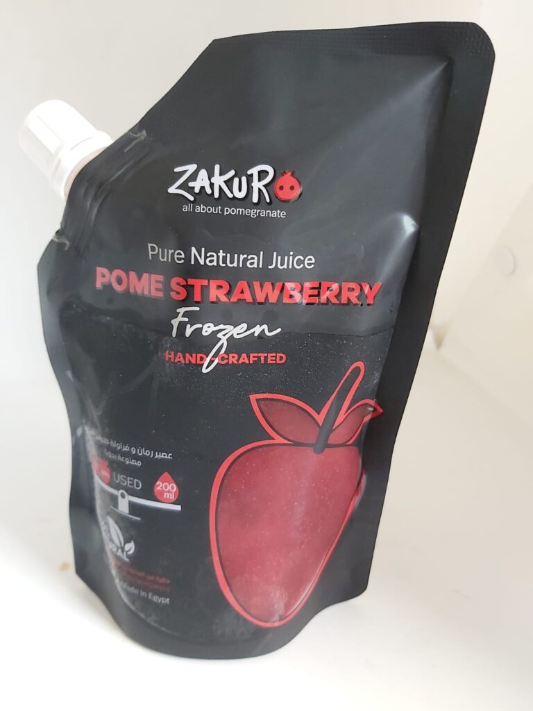 The juice comes from “Wonderful” pomegranates and strawberries grown in Egypt.