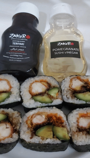 We have all natural sauces Gomadare (Japanese sesame dressing), Teriyaki, Balsamic, Balsamic Glaze, Pomegranate Sushi Vinegar.